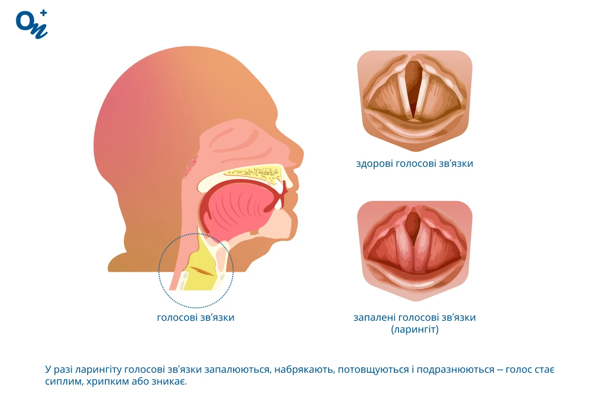 При ларингіті голосові зв'язки запалюються, набрякають, потовщуються і подразнюються, що значно ускладнює їхні нормальні коливання під час розмови. У результаті голос стає сипким, хрипким або пропадає зовсім.