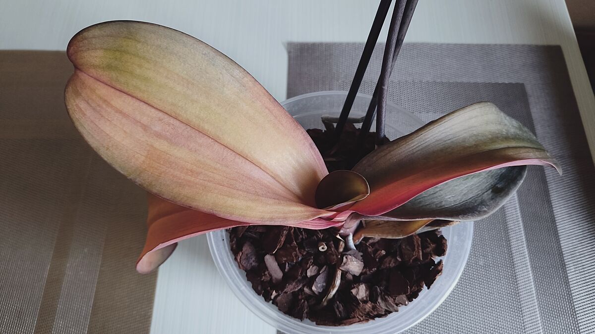 Добрий вечір, підкажіть, будь ласка, яка хворь напала на мою орхідею? Листя червоніє. Грунт-кора був вологим, підсушила його, коріння пусте …