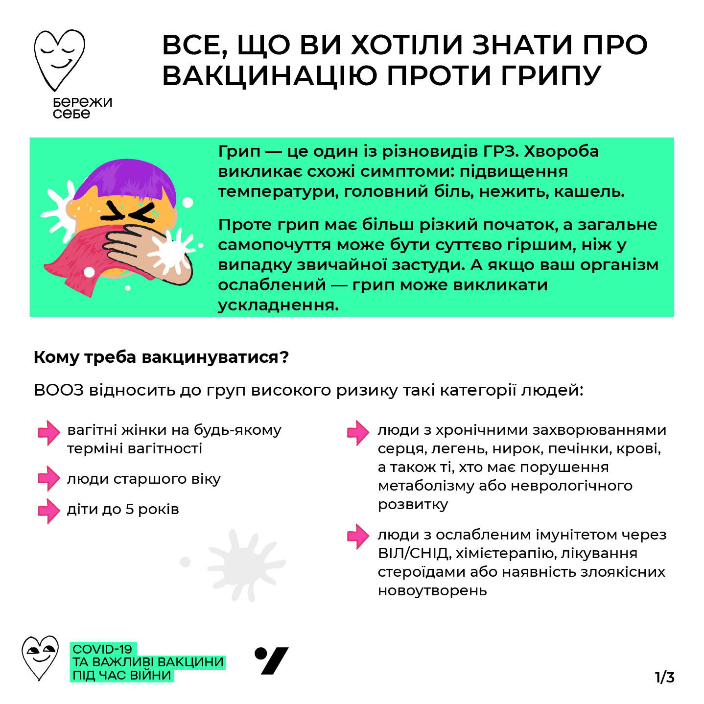 Вакцинація проти грипу знижує ризик захворіти на 40–60 %. У будь-якому разі захворювання проходитиме спокійніше: ризики ускладнень, госпіталіза …