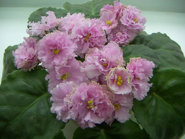 Очень крупные розовые махровые бахромчатые цветы с очень мелкими брызгами цвета, чуть темнее основного, на крепких цветоносах. Компактная розетка средне-зеленых …