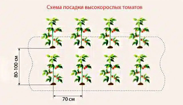 Скороспілим і низькорослим сортам з широкими кущами потрібно створити умови з достатньою віддаленістю один від одного (на 35–40 см), а з боків відстань між ними повинна бути не менше 0,5 метра. Високорослі томати саджають через один, роблячи при цьому великі пропуски – 70 см.