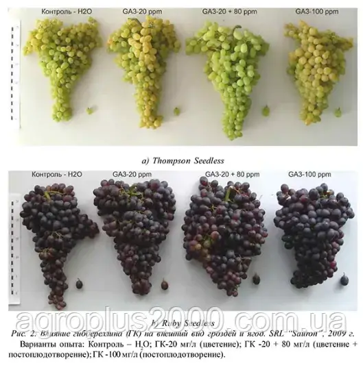 Використання гібереліна дозволяє збільшити розмір і вагу ягід безнасінневих сортів, кишмишів, а також розтягнути гребні, що розріджує щільні гр …