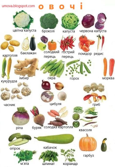ОВОЧІ ; Бобові, Біб овочевий, горох, квасоля звичайна ; Гарбузові, гарбуз волоський, гарбуз мускатний, гарбуз звичайний, диня, кабачок, кавун столовий, огірок …