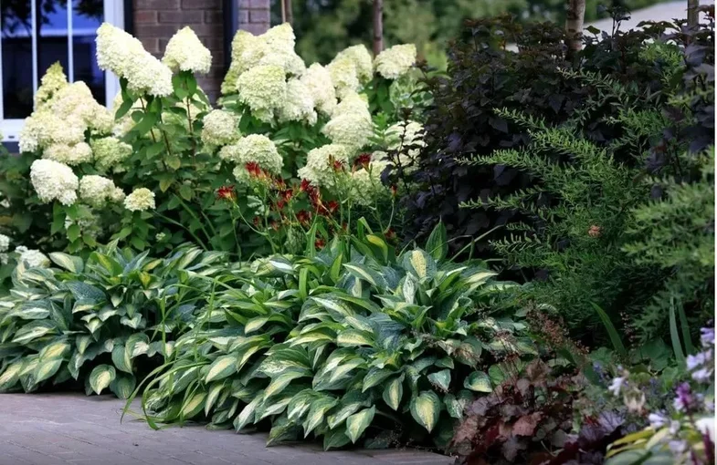 Контраст: гортензії мають великі, округлі суцвіття та декоративне листя, що створює чудовий контраст з різноманітним листям хост. Це збагачує …