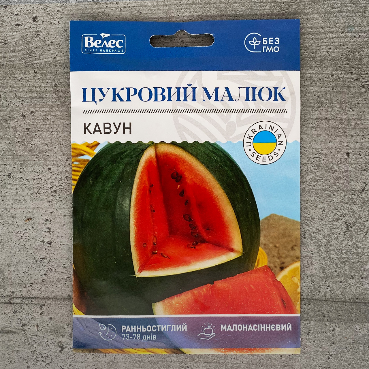 Кавун Цукровий Малюк – середньостиглий, невибагливий сорт типу Шуга Бейбі. Від висадки розсади до збору першого врожаю проходить 70-75 днів. Рослина сильноросл …