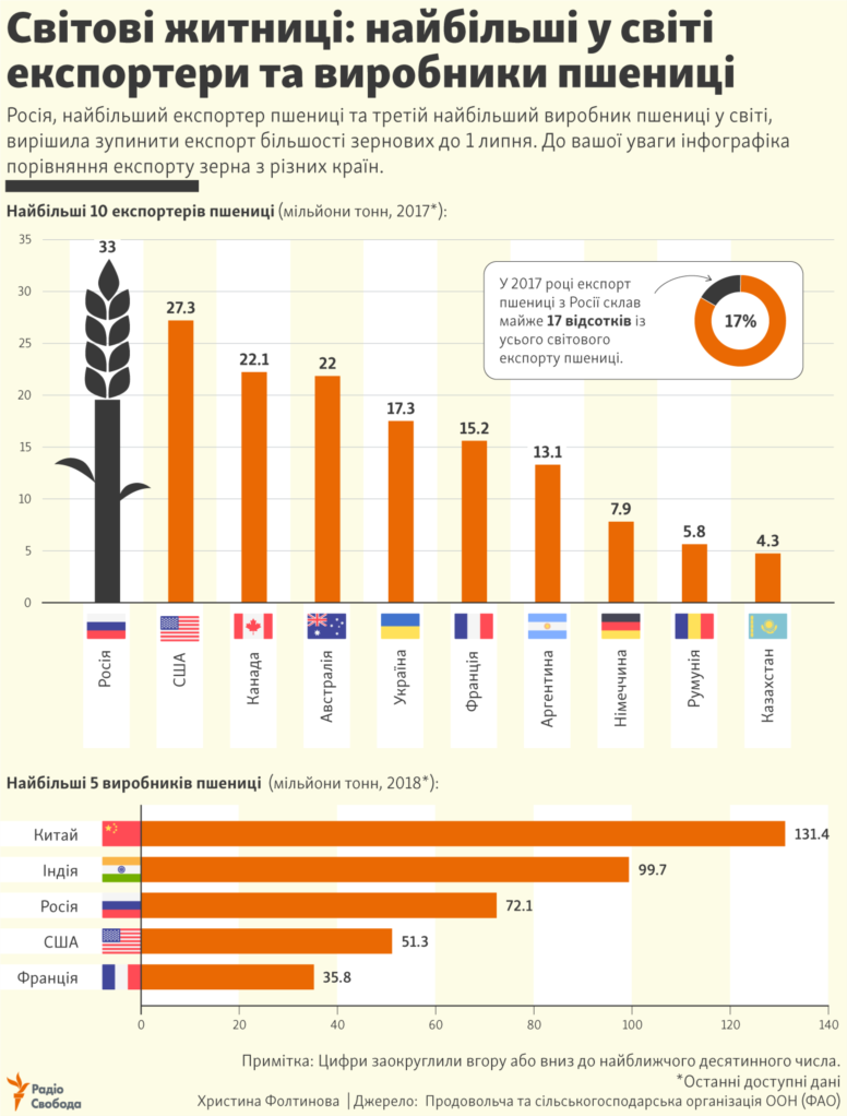 Експорт пшениці у 2021/22 МР · росія — 44,5 млн т; · Австралія — 32,5 млн т; · Канада — 26 млн т; · США — 21,1 млн т; · Франція— 18 млн т; · Україна — …