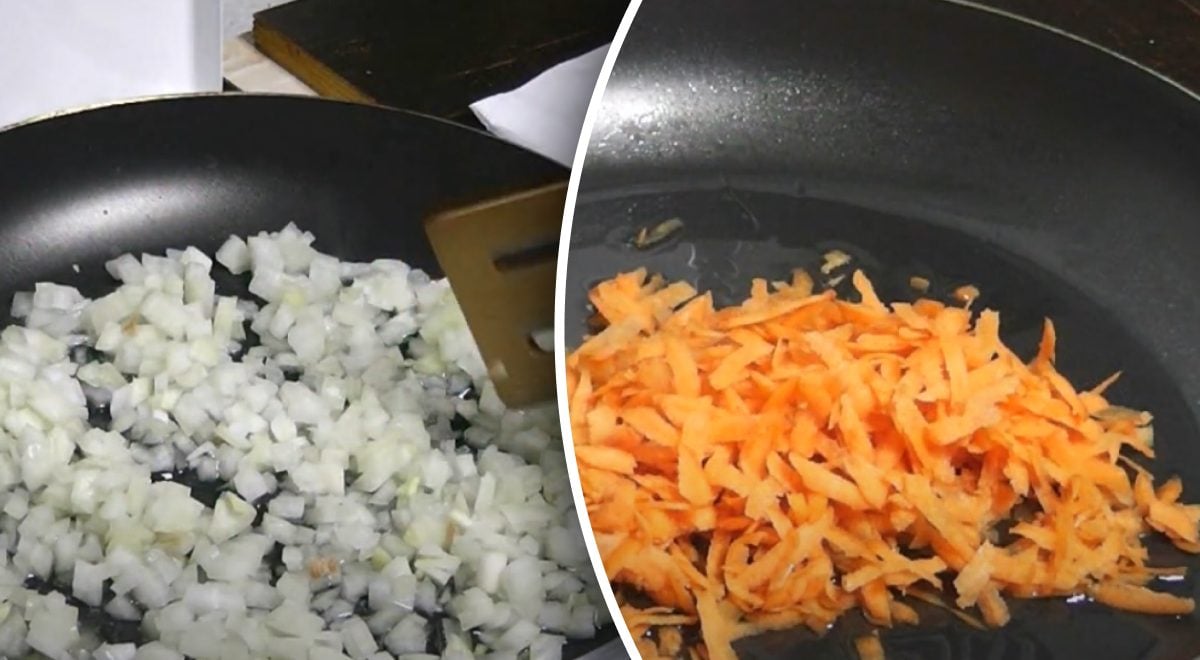 По-перше, потрібно дотримуватися пропорцій: для смаження візьміть 1 морквину, 1 цибулину і 3 столові ложки рослинного масла. Моркви додайте трохи більше, ніж цибулі. Спочатку на середньому вогні обсмажуємо цибулю протягом 3 хвилин, потім моркву.