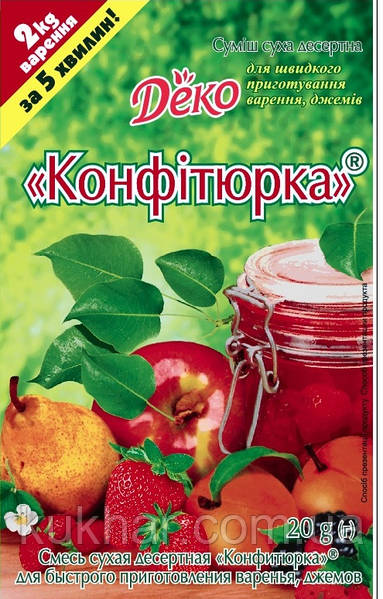 Конфітюрка 20г Деко … 12.38грн. … Бренд: ТМ «Деко». Поживна (харчова) цінність на 100 g (г) продукту: білки – 1,6 g (г), вуглеводи – 44 g (г). Енергетична …