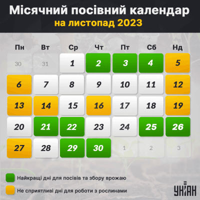 В листопаді буде й кілька хороших днів для висівання ягід і фруктів, і це 3-10 листопада. А ось вдалими днями для того, щоб сіяти або садити декоративні рослини, будуть: 3-7, 10-15 листопада для багаторічних та однорічних, а також кімнатних, а для бульбових і цибулинних – 17-19, 23 листопада.