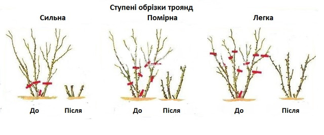 Троянди Флорібунда Старші пагони (близько 2-3 років) обрізають, залишаючи 3-4 бруньки, а однорічні вкорочують на 1\3 всієї довжини гілки.