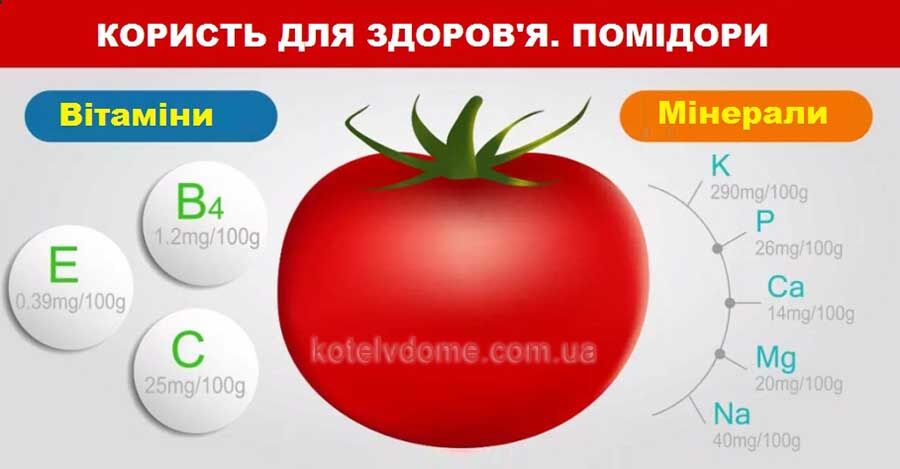 Томати лікують гіпертонію, покращують травлення, захищають від раку. Помідори корисні в будь-якому вигляді: у вигляді томатного соку, в вигляді кетчупу. У м'якоті плодів томатів присутні харчові волокна і рослинний білок, не кажучи вже по цінні органічні сполуки, назви яких важко вимовити і запам'ятати.