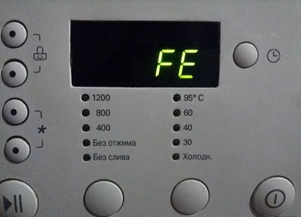 Из-за большого количества пены датчик уровня воды ошибочно принимает ее за перелив воды и выдает ошибку FE. Для устранения ошибки отключите стиральную машину, извлеките белье из бака и дайте ей просохнуть. Появления кода ошибки могло быть связано с кратковременным сбоем в модуле управления из-за скачков напряжения.