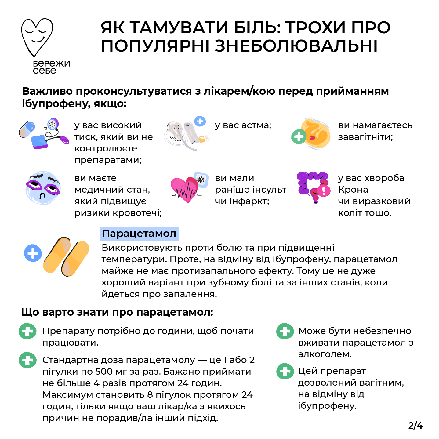 Парацетамол зазвичай краще працює для таких видів болю як головний біль та біль у животі. А от ібупрофен ефективніший проти болю при місячних та …