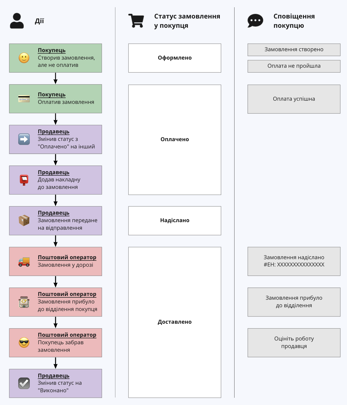 Статуси замовлення · Нове — замовлення оформлено, продавцю необхідно обробити його; · Оплачено — замовлення оплачено покупцем; · Прийнято — замовлення прийнято і …