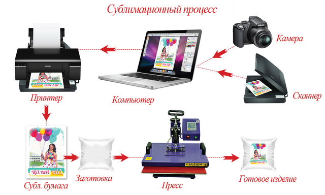 Для сублімаційного переносу потрібно таке обладнання і матеріали: термопрес, струменевий принтер з системою безперервної подачі чорнила, сублімаційні чорнила, сублімаційний папір, термостійка липка стрічка (скотч), заготовка під сублімацію.