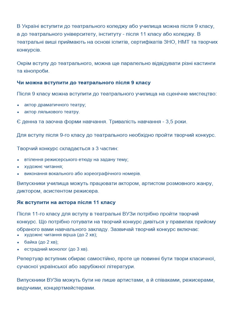 Для вступу після 9-го класу до театрального необхідно пройти творчий конкурс. Творчий конкурс складається з 3 частин: втілення режисерського етюду на задану …