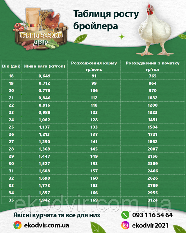 Для планування корму на період вирощування курчат-бройлерів слід орієнтуватися на середній розхід комбікорму на 1 кг приросту (жива маса курчати). Щоб отримати курчат-бройлерів масою тіла 2,3-2,5 кг у віці 6 тижнів (42 дні) у середньому витрачають 1,7-1,8 кг готового корму на 1 кг приросту.