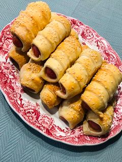 Щільно загорнути сосиску в смужку тіста. Викласти сосиски в тісті на деко, змастити тісто збитими жовтками для блиску. Випікати в духовці 20 хвилин при 180°.