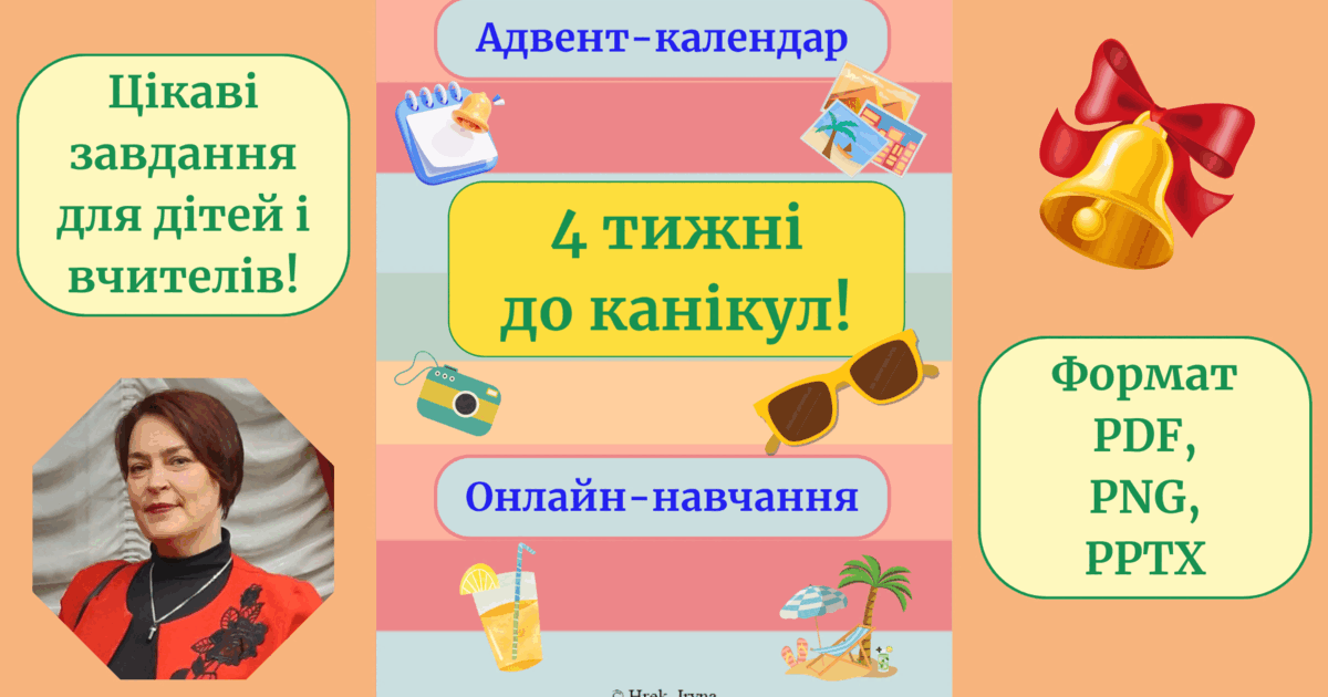 Пропоную авторський адвент-календар “4 тижні до канікул” у форматах PDF, PNG, PPTX. Також розроблені картки окремо для кожного дня, …