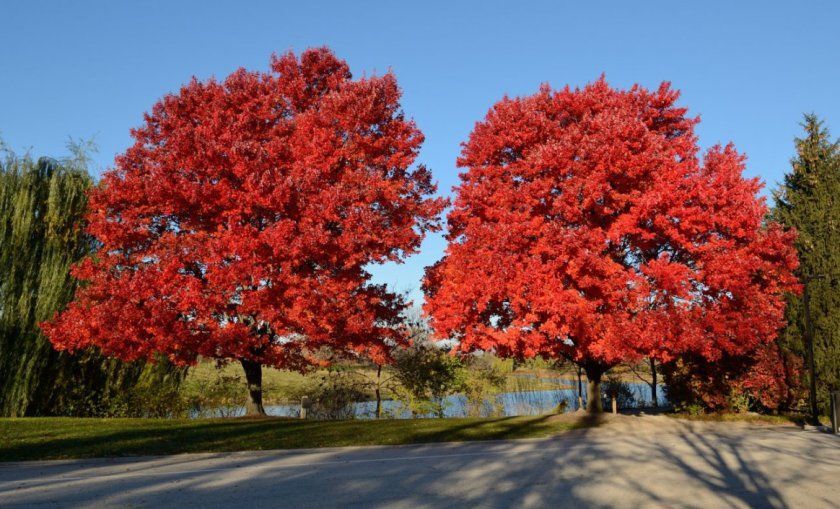 Які рослини мають червоне листя восени? · Глід (Crataegus) · Дуб червоний (Quercus rubra) · Клен (Acer) · Аронія (Aronia) · Красивоплідник ( …
