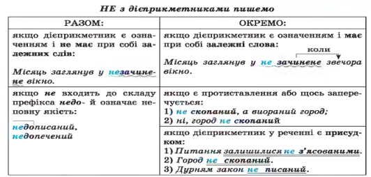 коли при дієприкметнику немає залежного слова: Я побачив на столі незавершений твір. коли при дієприкметнику є залежне слово: Я побачив на столі не завершений письменником твір. коли дієприкметник є означенням: незаповнений щоденник. коли дієприкметник є присудком: Щоденник не заповнений.
