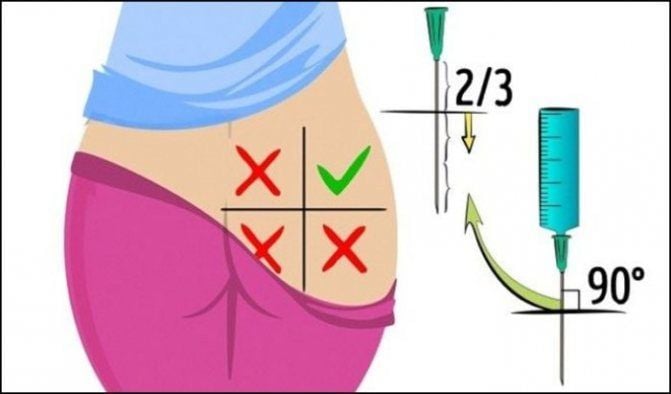 попросіть пацієнта лягти та розслабити м'язи; щоб зробити укол у сідницю, подумки розділіть її на чотири квадрати та виберіть для ін'єкції верхній крайній квадрат — так ви не зачепите сідничний м'яз; укол самому собі потрібно робити не в сідницю, а в зовнішню частину стегна.