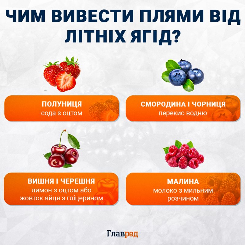 Якщо ягідні чи фруктові плями застарілі Застарілі плями, особливо від ягід і фруктів, відіпрати набагато важче. Для цього варто підготувати розчин з 4 г лимонної кислоти та 40 г 95% етилового спирту. Рідину потрібно підігріти на слабкому вогні, після чого замочити нею пляму та почекати її повного зникнення.