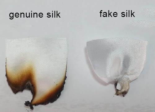 Натуральний пофарбований шовк має м'який блиск, на сонці переливається і іскрить, а штучний тьмяно блищить і відтінків ви не помітите. Натуральні шовкові волокна відрізняються від штучної нитки структурою, вони набагато м'якше і еластичнішою, тому і шовк майже не мнеться.
