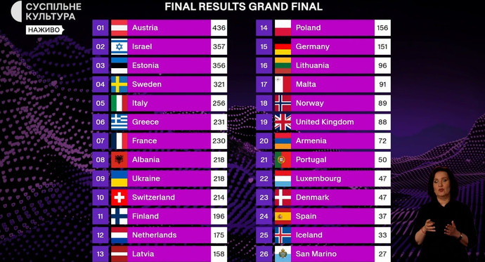 Бали від України озвучувала співачка Jerry Heil. Вона вийшла у прямий ефір «Євробачення-2025» з укриття у Києві. Українські глядачі віддали найбільше голосів (12 балів) за литовський гурт Katarsis.