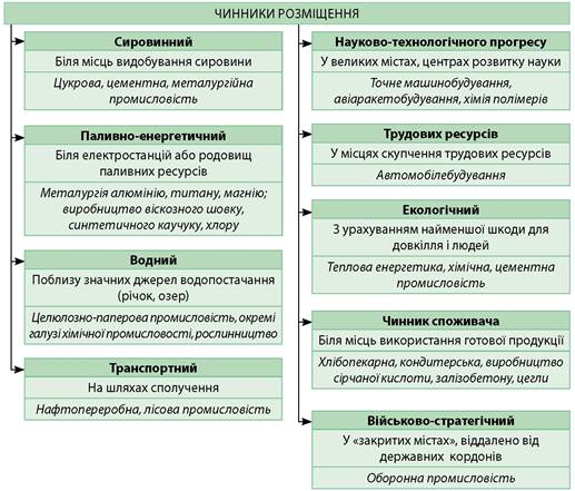 Чинники розміщення підприємств хімічної промисловості: сировинний; енергетичний; водний; фактор споживача; трудовий; транспортний; екологічний.