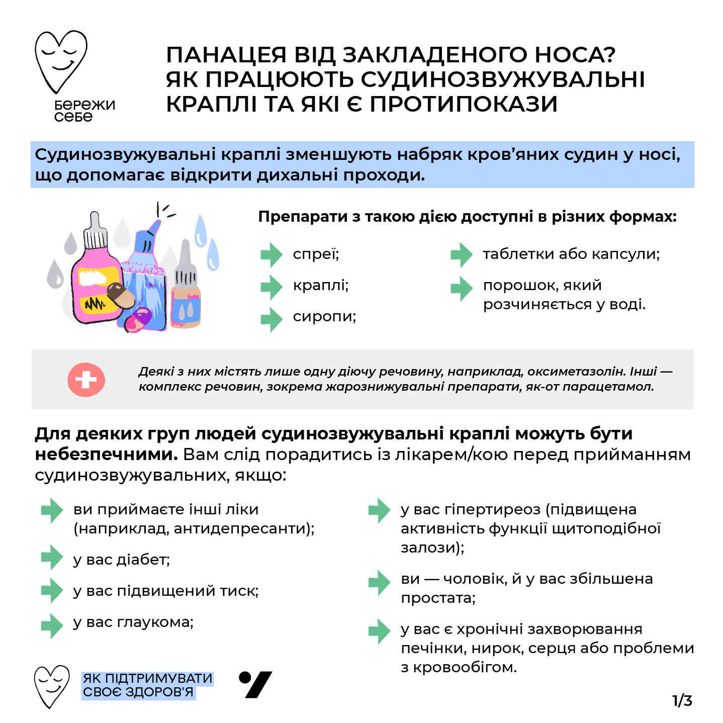 Деконгестанти (судинозвужуючі краплі) – допомагають швидко зняти закладеність носу та полегшувати дихання за рахунок звуження судин. Їхній ефект наступає вже через 25-30 секунд і може продовжуватися до 12 годин. Але при тривалому використанні або передозуванні препарати викликають звуження судин не тільки в носі.