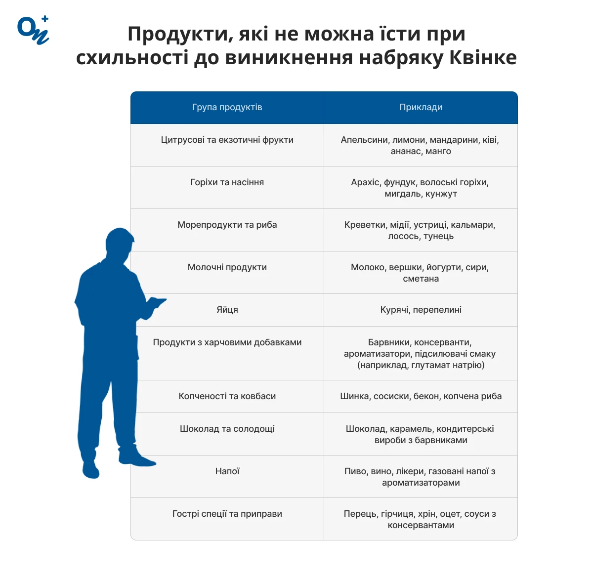 При набряку Квінке корисно вживати пісне м’ясо (індичатину, кролятину, яловичину), нежирну рибу (хек, тріску), крупи (рис, гречку, вівсянку), …