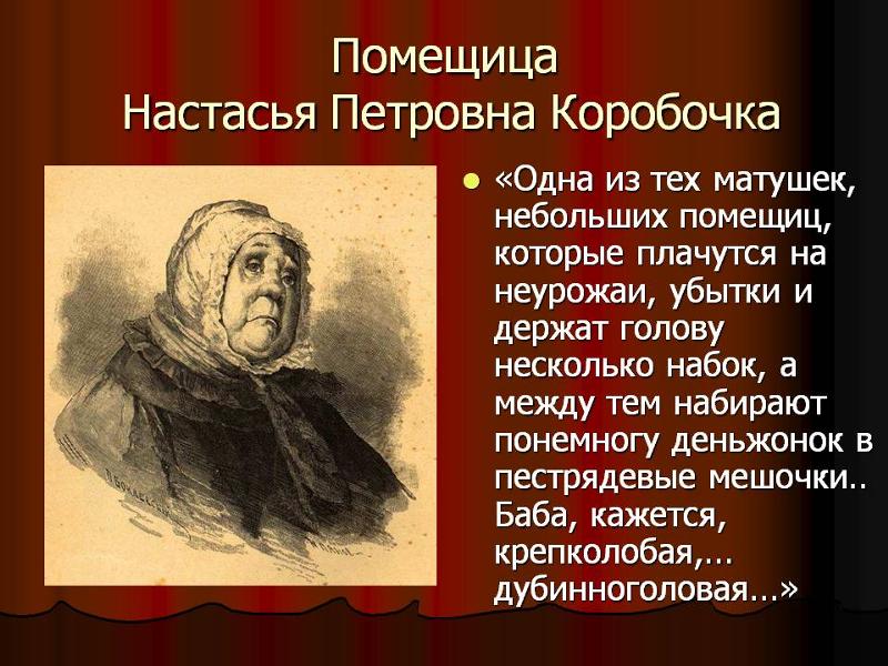 Характер Коробочки Она любит жаловаться, причем на все: плохой урожай, нищету. При этом у Коробочки есть деньги, она раскладывает их по мешочкам, но постоянно прибедняется, чтобы вызвать жалость. Окружающие считают Настасью Петровну глупой старухой. Действительно, Гоголь подчеркивает необразованность героини.