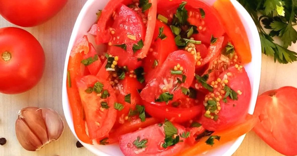 Інгредієнти · 0,5 кг помідорів · 1 болгарський перець · 1 пучок кропу · 3 зубчика часнику · 4 ст. л. запашної олії · 1 ч. л. соли · 1 ч. л. цукру · 2 ч.
